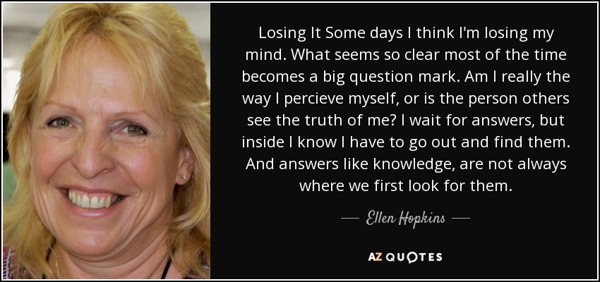 Losing It Some days I think I'm losing my mind. What seems so clear most of the time becomes a big question mark. Am I really the way I percieve myself, or is the person others see the truth of me? I wait for answers, but inside I know I have to go out and find them. And answers like knowledge, are not always where we first look for them.