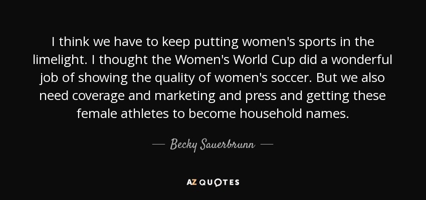 I think we have to keep putting women's sports in the limelight. I thought the Women's World Cup did a wonderful job of showing the quality of women's soccer. But we also need coverage and marketing and press and getting these female athletes to become household names.