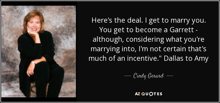 Here's the deal. I get to marry you. You get to become a Garrett - although, considering what you're marrying into, I'm not certain that's much of an incentive." Dallas to Amy