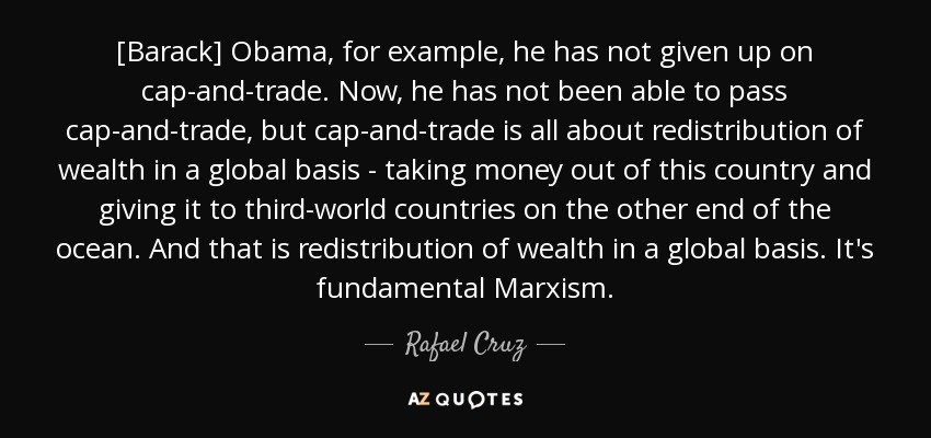[Barack] Obama, for example, he has not given up on cap-and-trade. Now, he has not been able to pass cap-and-trade, but cap-and-trade is all about redistribution of wealth in a global basis - taking money out of this country and giving it to third-world countries on the other end of the ocean. And that is redistribution of wealth in a global basis. It's fundamental Marxism.