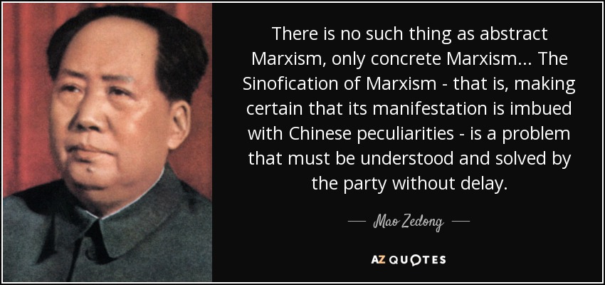 There is no such thing as abstract Marxism, only concrete Marxism... The Sinofication of Marxism - that is, making certain that its manifestation is imbued with Chinese peculiarities - is a problem that must be understood and solved by the party without delay.