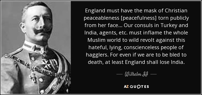 England must have the mask of Christian peaceableness [peacefulness] torn publicly from her face... Our consuls in Turkey and India, agents, etc. must inflame the whole Muslim world to wild revolt against this hateful, lying, conscienceless people of hagglers. For even if we are to be bled to death, at least England shall lose India.