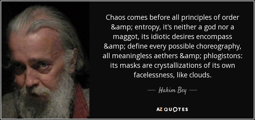 Chaos comes before all principles of order & entropy, it's neither a god nor a maggot, its idiotic desires encompass & define every possible choreography, all meaningless aethers & phlogistons: its masks are crystallizations of its own facelessness, like clouds.