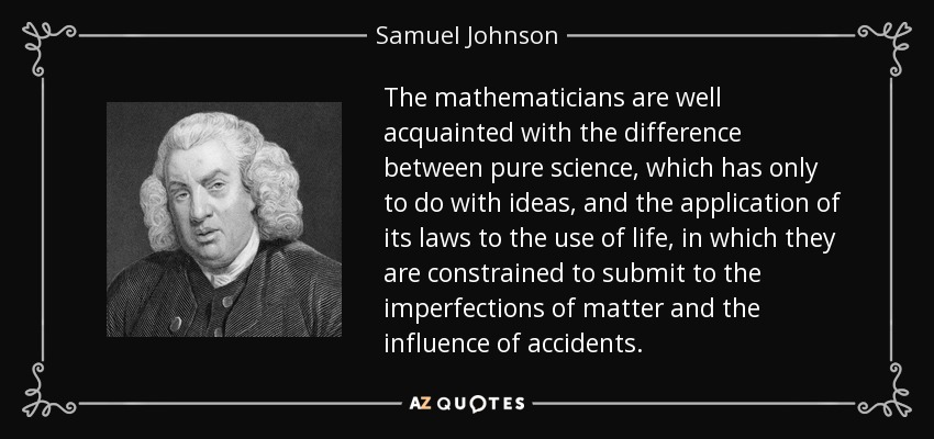 The mathematicians are well acquainted with the difference between pure science, which has only to do with ideas, and the application of its laws to the use of life, in which they are constrained to submit to the imperfections of matter and the influence of accidents.