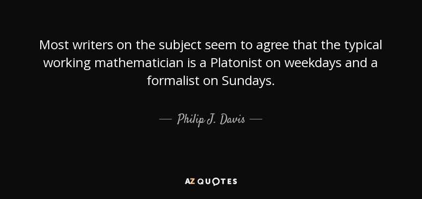 Most writers on the subject seem to agree that the typical working mathematician is a Platonist on weekdays and a formalist on Sundays.