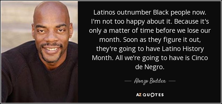 Latinos outnumber Black people now. I'm not too happy about it. Because it's only a matter of time before we lose our month. Soon as they figure it out, they're going to have Latino History Month. All we're going to have is Cinco de Negro.