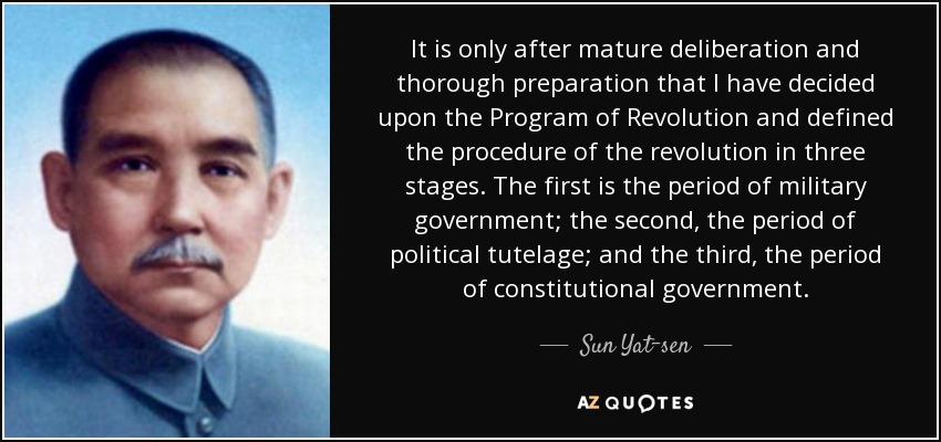 It is only after mature deliberation and thorough preparation that I have decided upon the Program of Revolution and defined the procedure of the revolution in three stages. The first is the period of military government; the second, the period of political tutelage; and the third, the period of constitutional government.