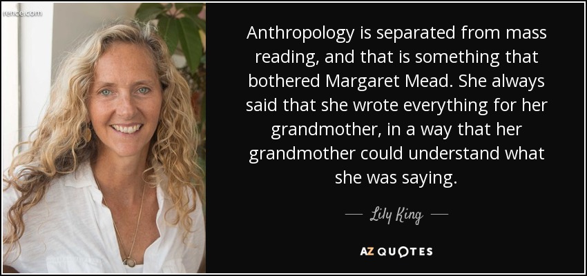 Anthropology is separated from mass reading, and that is something that bothered Margaret Mead. She always said that she wrote everything for her grandmother, in a way that her grandmother could understand what she was saying.