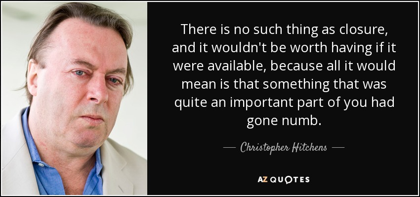 There is no such thing as closure, and it wouldn't be worth having if it were available, because all it would mean is that something that was quite an important part of you had gone numb.