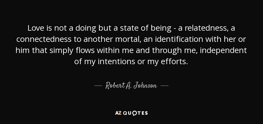 Love is not a doing but a state of being - a relatedness, a connectedness to another mortal, an identification with her or him that simply flows within me and through me, independent of my intentions or my efforts.
