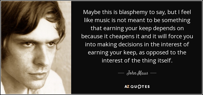 Maybe this is blasphemy to say, but I feel like music is not meant to be something that earning your keep depends on because it cheapens it and it will force you into making decisions in the interest of earning your keep, as opposed to the interest of the thing itself.