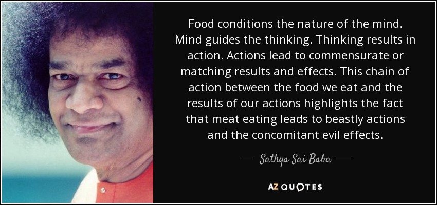 Food conditions the nature of the mind. Mind guides the thinking. Thinking results in action. Actions lead to commensurate or matching results and effects. This chain of action between the food we eat and the results of our actions highlights the fact that meat eating leads to beastly actions and the concomitant evil effects.