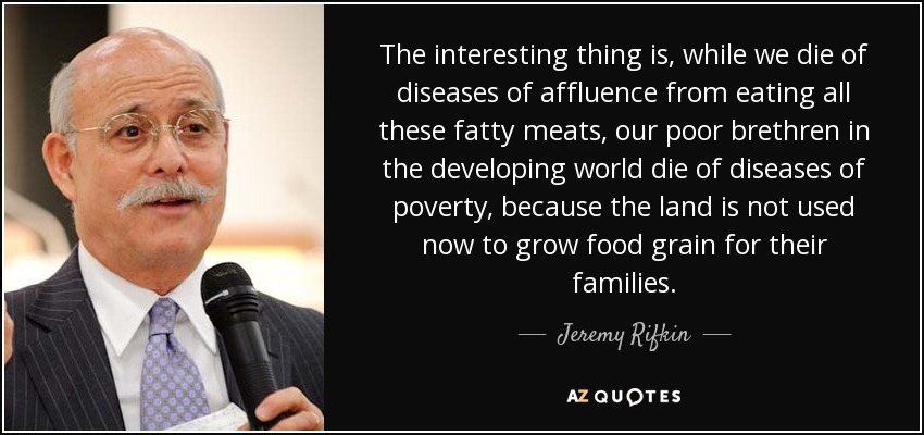 The interesting thing is, while we die of diseases of affluence from eating all these fatty meats, our poor brethren in the developing world die of diseases of poverty, because the land is not used now to grow food grain for their families.