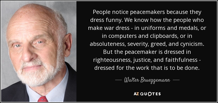 People notice peacemakers because they dress funny. We know how the people who make war dress - in uniforms and medals, or in computers and clipboards, or in absoluteness, severity, greed, and cynicism. But the peacemaker is dressed in righteousness, justice, and faithfulness - dressed for the work that is to be done.