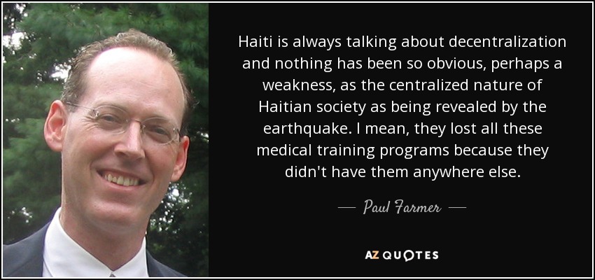 Haiti is always talking about decentralization and nothing has been so obvious, perhaps a weakness, as the centralized nature of Haitian society as being revealed by the earthquake. I mean, they lost all these medical training programs because they didn't have them anywhere else.