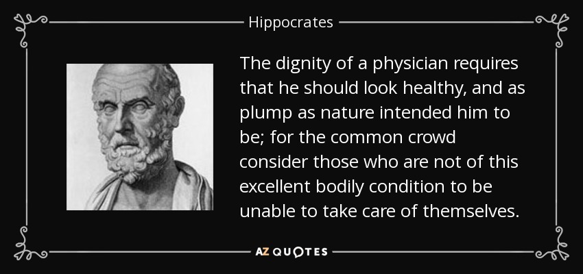 The dignity of a physician requires that he should look healthy, and as plump as nature intended him to be; for the common crowd consider those who are not of this excellent bodily condition to be unable to take care of themselves.