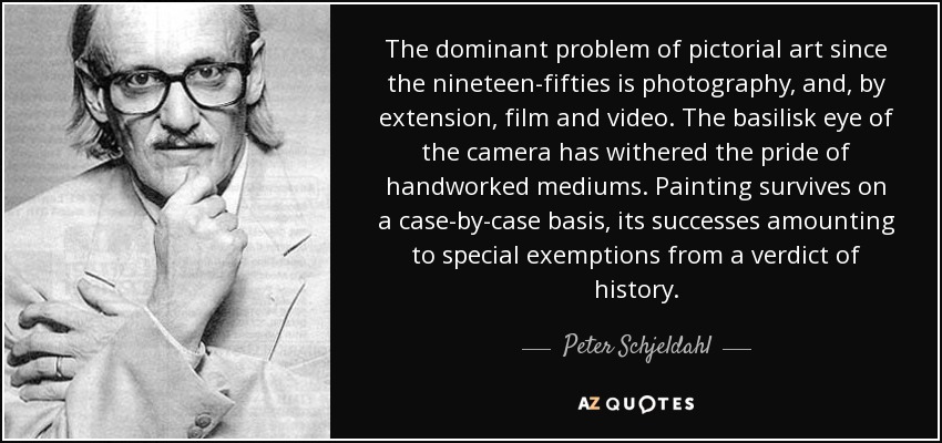 The dominant problem of pictorial art since the nineteen-fifties is photography, and, by extension, film and video. The basilisk eye of the camera has withered the pride of handworked mediums. Painting survives on a case-by-case basis, its successes amounting to special exemptions from a verdict of history.