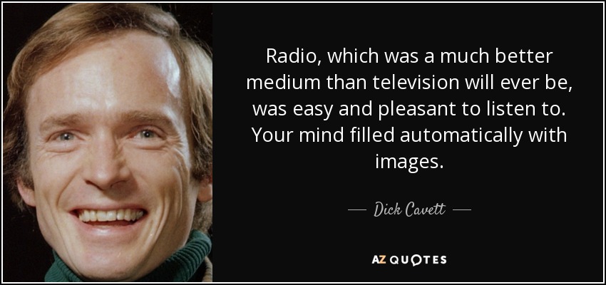 Radio, which was a much better medium than television will ever be, was easy and pleasant to listen to. Your mind filled automatically with images.