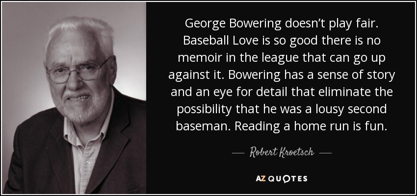 George Bowering doesn’t play fair. Baseball Love is so good there is no memoir in the league that can go up against it. Bowering has a sense of story and an eye for detail that eliminate the possibility that he was a lousy second baseman. Reading a home run is fun.