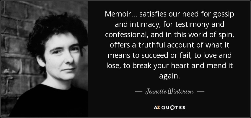 Memoir ... satisfies our need for gossip and intimacy, for testimony and confessional, and in this world of spin, offers a truthful account of what it means to succeed or fail, to love and lose, to break your heart and mend it again.