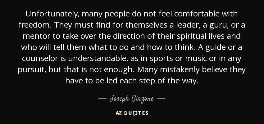 Unfortunately, many people do not feel comfortable with freedom. They must find for themselves a leader, a guru, or a mentor to take over the direction of their spiritual lives and who will tell them what to do and how to think. A guide or a counselor is understandable, as in sports or music or in any pursuit, but that is not enough. Many mistakenly believe they have to be led each step of the way.