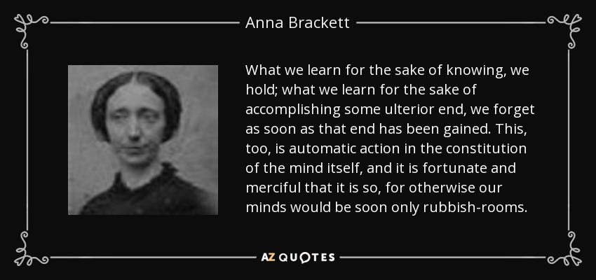 What we learn for the sake of knowing, we hold; what we learn for the sake of accomplishing some ulterior end, we forget as soon as that end has been gained. This, too, is automatic action in the constitution of the mind itself, and it is fortunate and merciful that it is so, for otherwise our minds would be soon only rubbish-rooms.