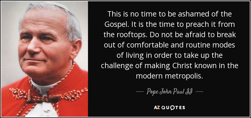 This is no time to be ashamed of the Gospel. It is the time to preach it from the rooftops. Do not be afraid to break out of comfortable and routine modes of living in order to take up the challenge of making Christ known in the modern metropolis.