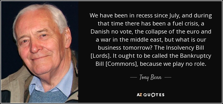 We have been in recess since July, and during that time there has been a fuel crisis, a Danish no vote, the collapse of the euro and a war in the middle east, but what is our business tomorrow? The Insolvency Bill [Lords]. It ought to be called the Bankruptcy Bill [Commons], because we play no role.