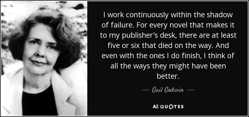 I work continuously within the shadow of failure. For every novel that makes it to my publisher's desk, there are at least five or six that died on the way. And even with the ones I do finish, I think of all the ways they might have been better.