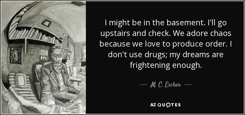 I might be in the basement. I'll go upstairs and check. We adore chaos because we love to produce order. I don't use drugs; my dreams are frightening enough.