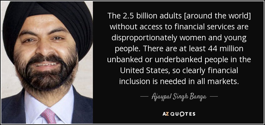 The 2.5 billion adults [around the world] without access to financial services are disproportionately women and young people. There are at least 44 million unbanked or underbanked people in the United States, so clearly financial inclusion is needed in all markets.