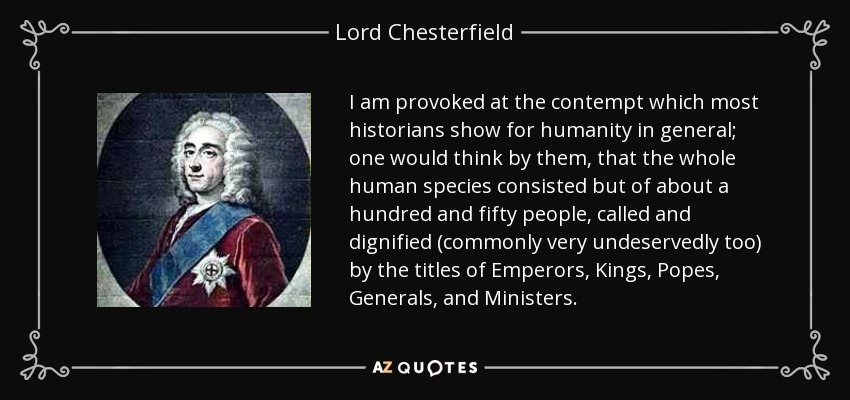 I am provoked at the contempt which most historians show for humanity in general; one would think by them, that the whole human species consisted but of about a hundred and fifty people, called and dignified (commonly very undeservedly too) by the titles of Emperors, Kings, Popes, Generals, and Ministers.