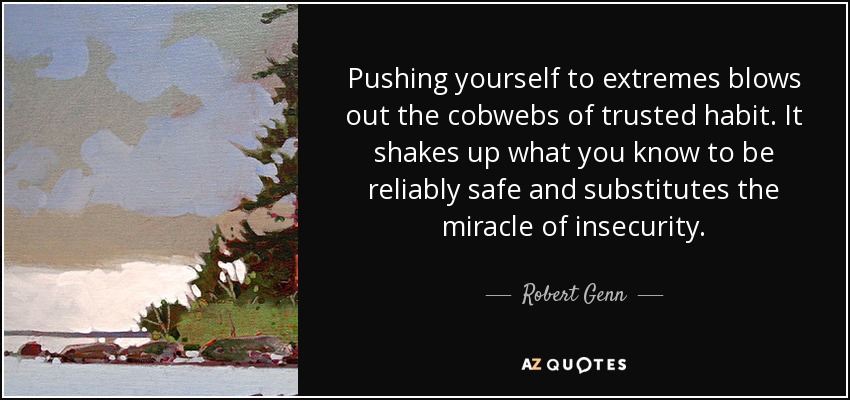 Pushing yourself to extremes blows out the cobwebs of trusted habit. It shakes up what you know to be reliably safe and substitutes the miracle of insecurity.