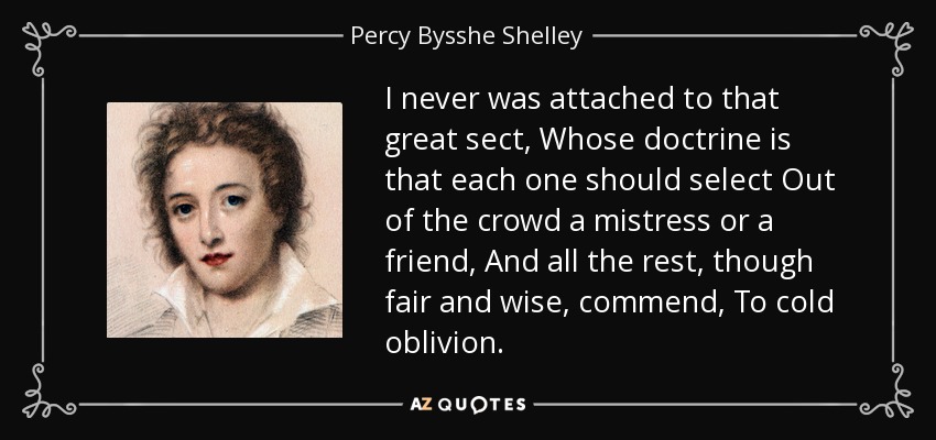 I never was attached to that great sect, Whose doctrine is that each one should select Out of the crowd a mistress or a friend, And all the rest, though fair and wise, commend, To cold oblivion.