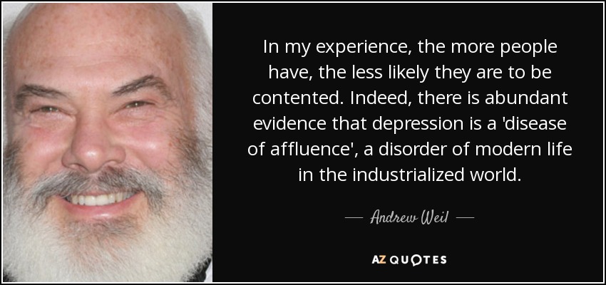 In my experience, the more people have, the less likely they are to be contented. Indeed, there is abundant evidence that depression is a 'disease of affluence', a disorder of modern life in the industrialized world.