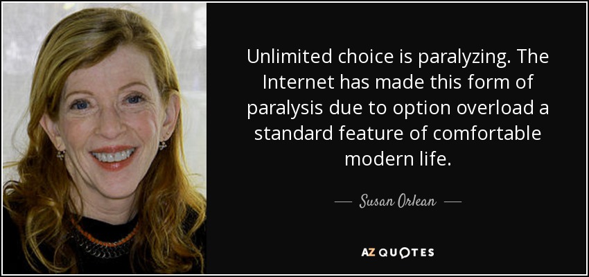 Unlimited choice is paralyzing. The Internet has made this form of paralysis due to option overload a standard feature of comfortable modern life.
