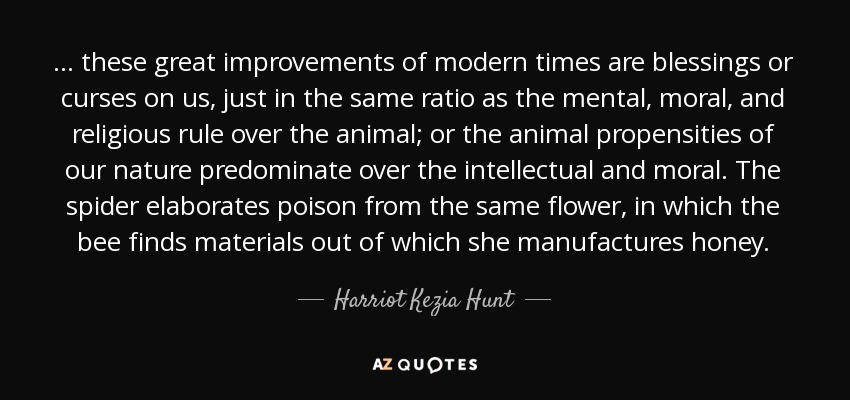 ... these great improvements of modern times are blessings or curses on us, just in the same ratio as the mental, moral, and religious rule over the animal; or the animal propensities of our nature predominate over the intellectual and moral. The spider elaborates poison from the same flower, in which the bee finds materials out of which she manufactures honey.