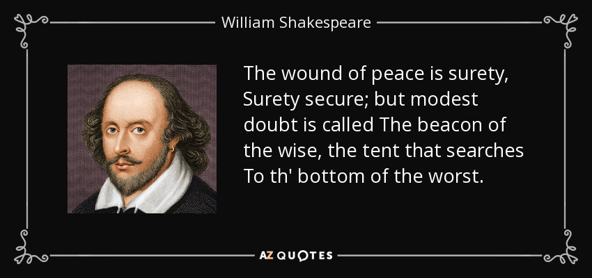 The wound of peace is surety, Surety secure; but modest doubt is called The beacon of the wise, the tent that searches To th' bottom of the worst.