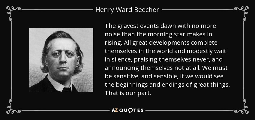 The gravest events dawn with no more noise than the morning star makes in rising. All great developments complete themselves in the world and modestly wait in silence, praising themselves never, and announcing themselves not at all. We must be sensitive, and sensible, if we would see the beginnings and endings of great things. That is our part.
