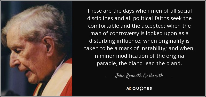 These are the days when men of all social disciplines and all political faiths seek the comfortable and the accepted; when the man of controversy is looked upon as a disturbing influence; when originality is taken to be a mark of instability; and when, in minor modification of the original parable, the bland lead the bland.