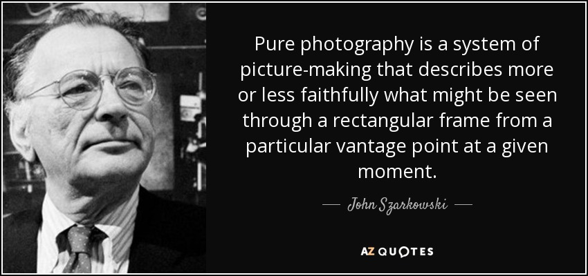 Pure photography is a system of picture-making that describes more or less faithfully what might be seen through a rectangular frame from a particular vantage point at a given moment.