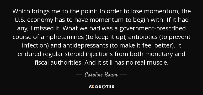 Which brings me to the point: In order to lose momentum, the U.S. economy has to have momentum to begin with. If it had any, I missed it. What we had was a government-prescribed course of amphetamines (to keep it up), antibiotics (to prevent infection) and antidepressants (to make it feel better). It endured regular steroid injections from both monetary and fiscal authorities. And it still has no real muscle.