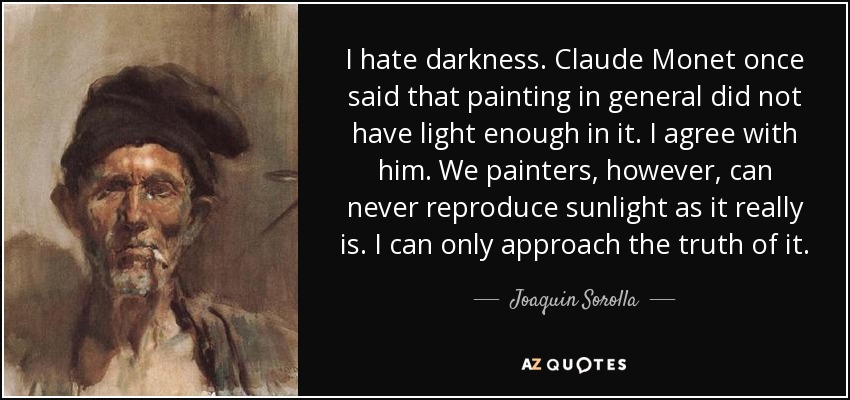 I hate darkness. Claude Monet once said that painting in general did not have light enough in it. I agree with him. We painters, however, can never reproduce sunlight as it really is. I can only approach the truth of it.