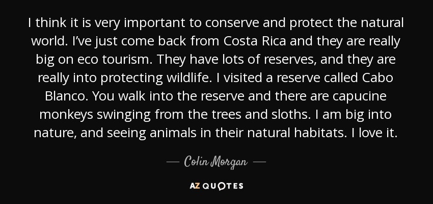 I think it is very important to conserve and protect the natural world. I’ve just come back from Costa Rica and they are really big on eco tourism. They have lots of reserves, and they are really into protecting wildlife. I visited a reserve called Cabo Blanco. You walk into the reserve and there are capucine monkeys swinging from the trees and sloths. I am big into nature, and seeing animals in their natural habitats. I love it.
