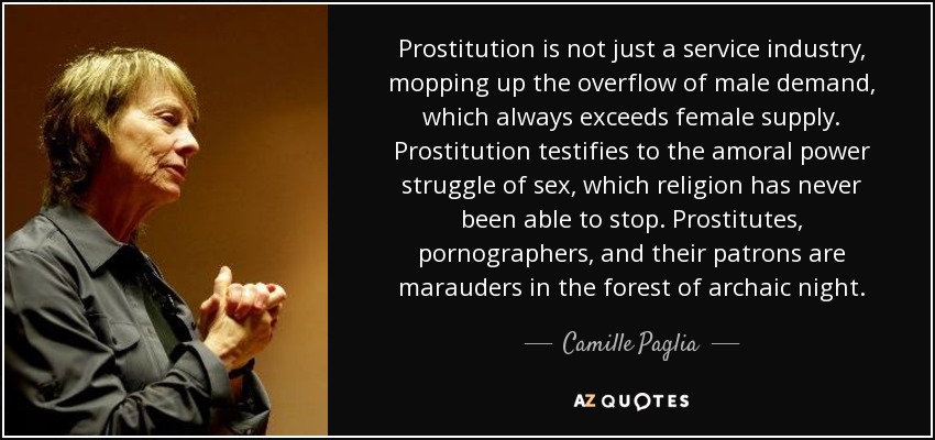 Prostitution is not just a service industry, mopping up the overflow of male demand, which always exceeds female supply. Prostitution testifies to the amoral power struggle of sex, which religion has never been able to stop. Prostitutes, pornographers, and their patrons are marauders in the forest of archaic night.