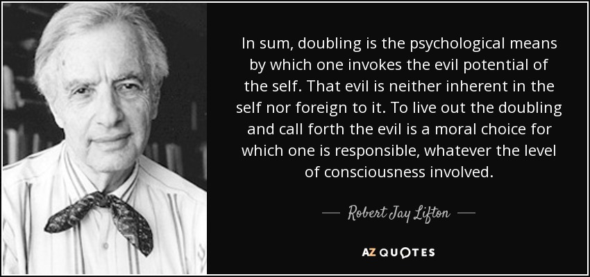 In sum, doubling is the psychological means by which one invokes the evil potential of the self. That evil is neither inherent in the self nor foreign to it. To live out the doubling and call forth the evil is a moral choice for which one is responsible, whatever the level of consciousness involved.