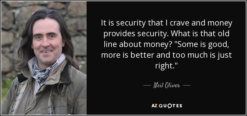 It is security that I crave and money provides security. What is that old line about money? "Some is good, more is better and too much is just right."