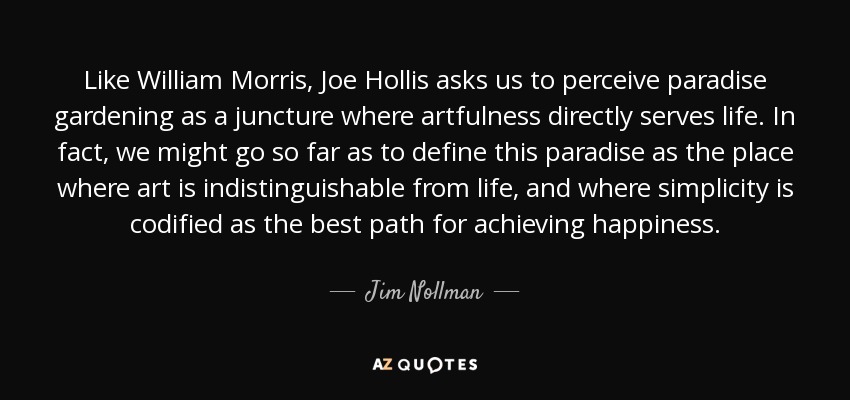 Like William Morris, Joe Hollis asks us to perceive paradise gardening as a juncture where artfulness directly serves life. In fact, we might go so far as to define this paradise as the place where art is indistinguishable from life, and where simplicity is codified as the best path for achieving happiness.
