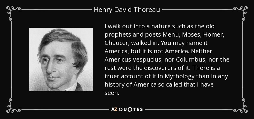 I walk out into a nature such as the old prophets and poets Menu, Moses, Homer, Chaucer, walked in. You may name it America, but it is not America. Neither Americus Vespucius, nor Columbus, nor the rest were the discoverers of it. There is a truer account of it in Mythology than in any history of America so called that I have seen.