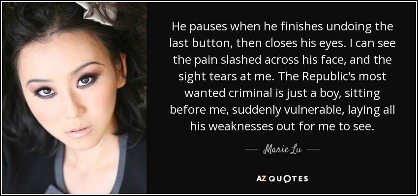 He pauses when he finishes undoing the last button, then closes his eyes. I can see the pain slashed across his face, and the sight tears at me. The Republic's most wanted criminal is just a boy, sitting before me, suddenly vulnerable, laying all his weaknesses out for me to see.
